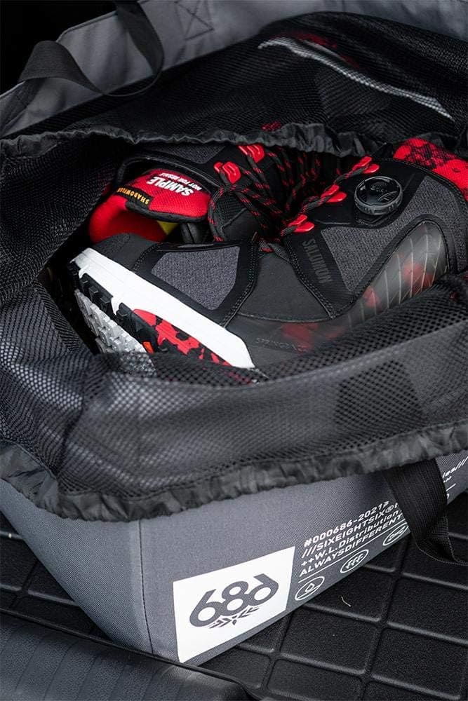 This one’s not your typical boot bag. 686 basically made a crossover between a gym duffel, travel bag and gear hauler – then added some snowboard-friendly touches like EVA panels and mesh ventilation. I wouldn’t pick it as my only boot bag if I was flying a lot or carrying heavy wet boots all the time, but as a second bag or something you keep in the car, it’s actually pretty handy.