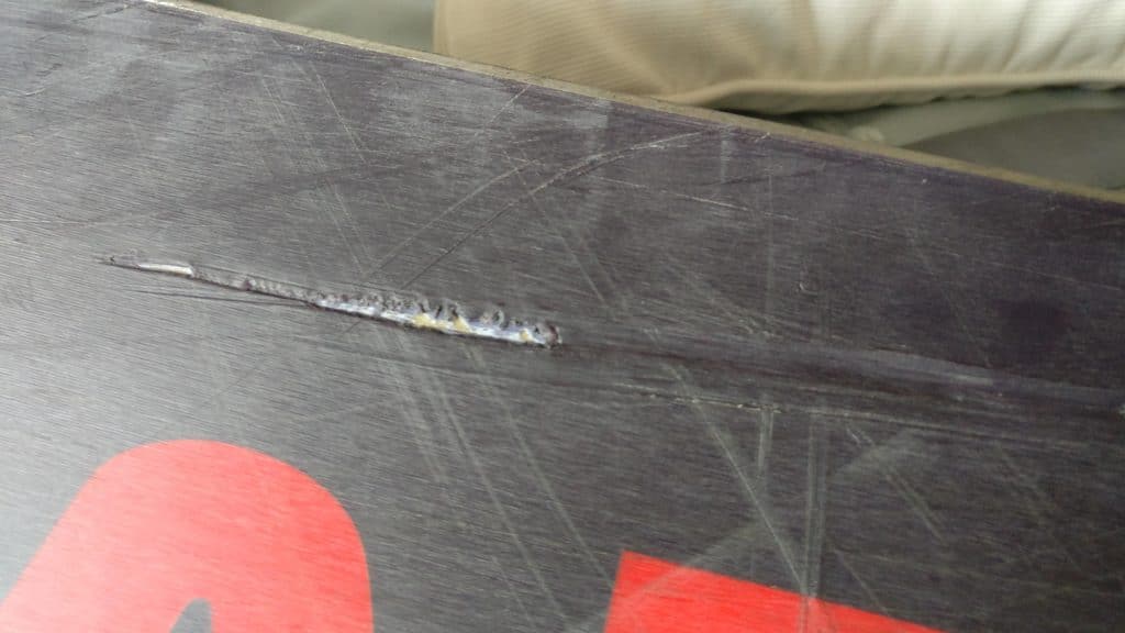 The topsheet doesn’t really affect performance, but it tells the story. Chips around the nose, cracks by the bindings, bubbling where water sneaks in — it all adds up.