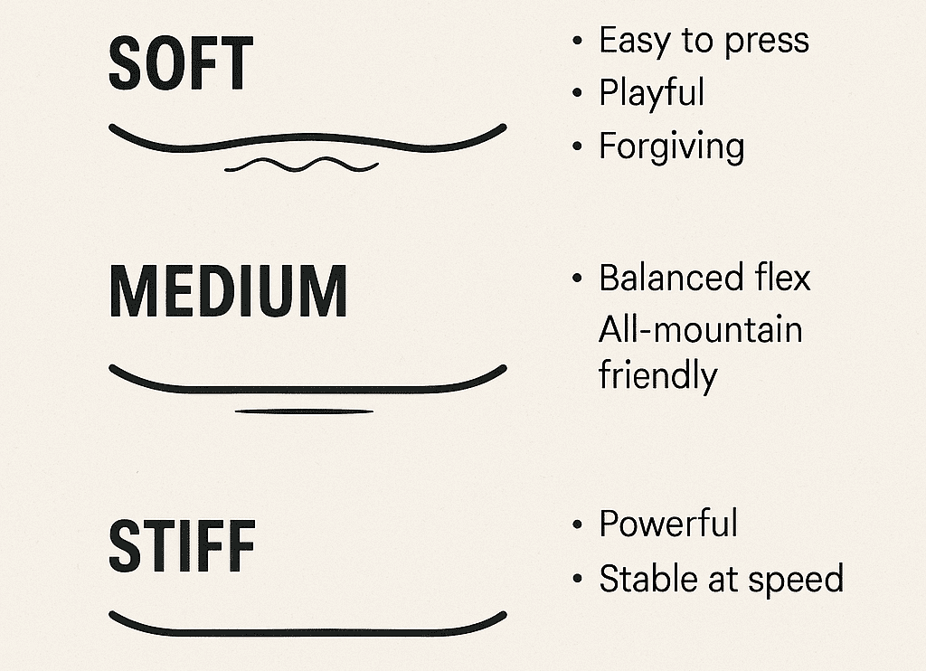 Stiff boards are the opposite. They want speed and commitment. You have to put energy into them, but they pay you back with stability, precision, and pop. Medium flex lands in the middle — versatile, easy to handle and solid enough for most riders.